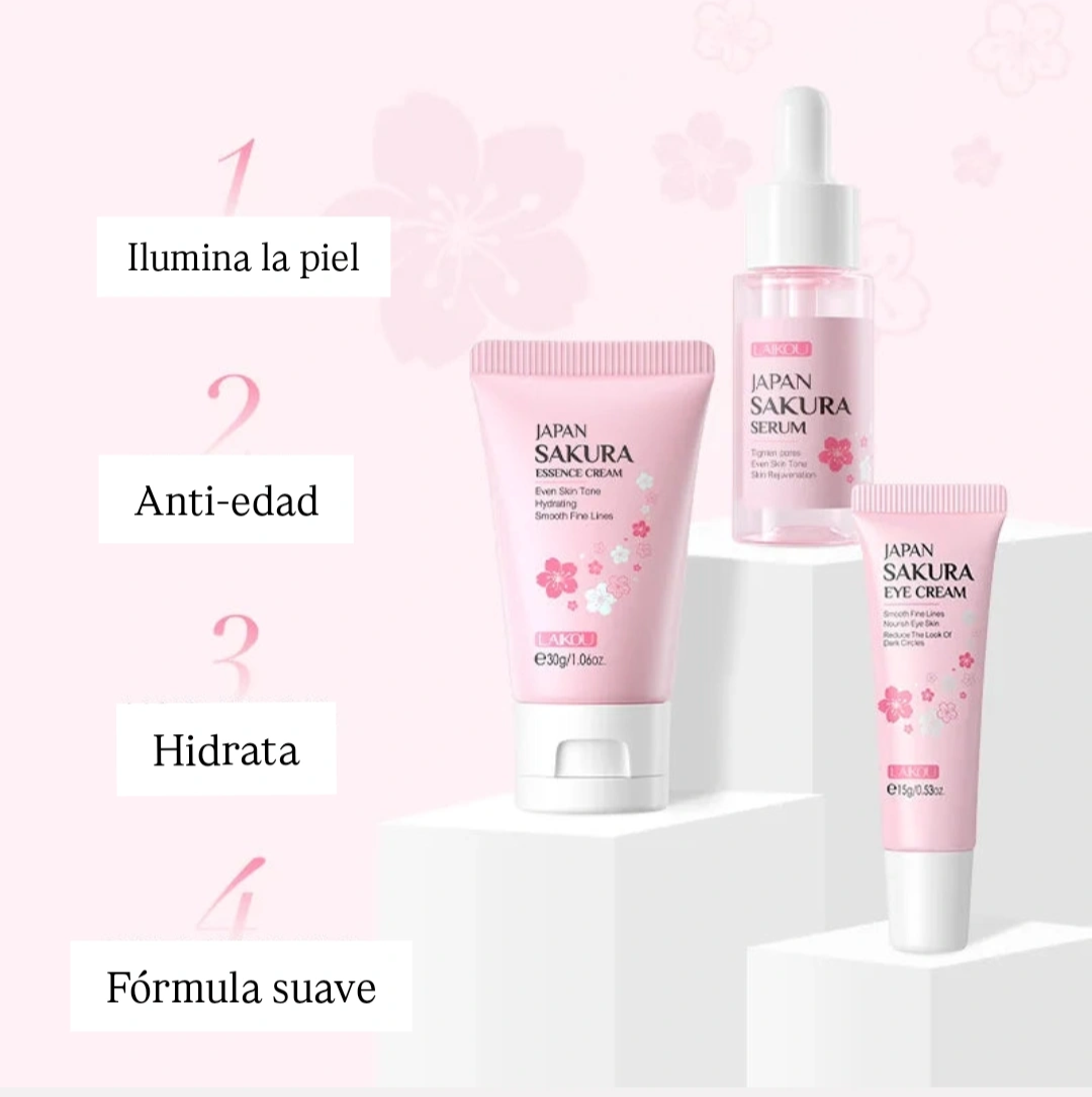 Incluye tónico, sérum, crema, limpiador y loción — tu rutina completa de hidratación y luminosidad, con el delicado aroma floral de Japón.